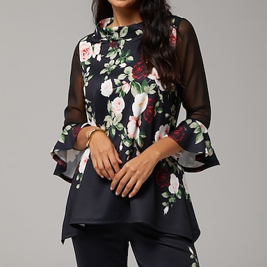 pantalon femme tissu extensible imprimé floral mousseline panneaux transparents jambe évasée taille élastique élégant confortable quotidien travail automne
