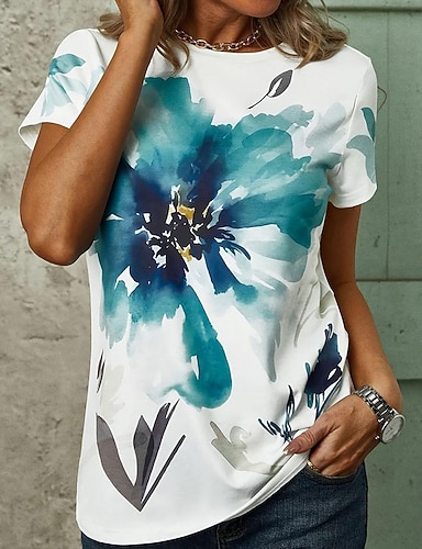 Femmes T-shirt Imprimé Fleuri Occasionnel Manche Courte Col en V Hauts Réguliers Quotidien Sortir Bleu Rose Claire Vert Été