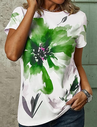 Femmes T-shirt Imprimé Fleuri Graphique Mode Élégant Classique Manche Courte Col asymétrique Hauts Réguliers Quotidien Sortir Week-end Blanche Rose Claire Vert Été Printemps