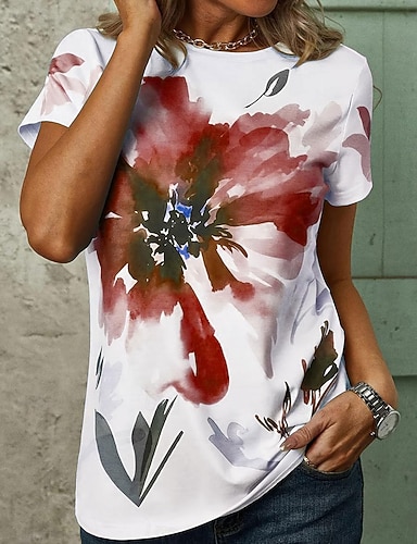 Femmes T-shirt Imprimé Fleuri Mode Moderne Manche Courte Col ras du cou Hauts Réguliers Quotidien Jaune Rose Claire Gris Été