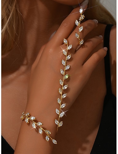 Ensemble bracelet et bague pour femme en feuille d'or et cristal - élégant bijou de main en strass pour les fêtes et les soirées &occasions spéciales
