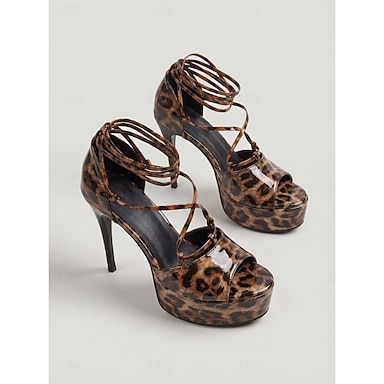 Sandales à talons hauts compensées à imprimé léopard pour femmes, chaussures de soirée à lacets et stilettos pour les sorties nocturnes et en boîte de nuit &looks audacieux