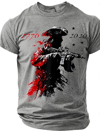 T-shirt graphique gris chiné décontracté, collection commémorative du 250e anniversaire de la 1776-2026, avec un fusil tactique Minuteman moderne et un motif patriotique représentant le 2e amendement.