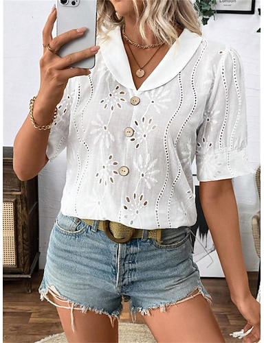 Femmes Hauts d'été Chemisier Haut à œillets Froncé Patchwork Broderie Fleuri Uni Élégant ancien Dames Demi Manches Col Rond Claudine Hauts Réguliers Quotidien Travail Fête Noir Blanche Été Printemps