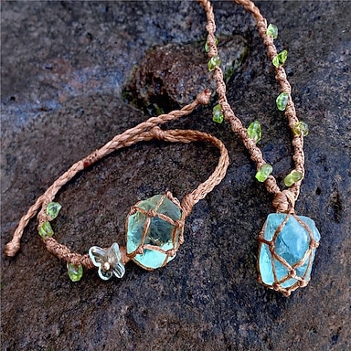 Ensemble collier et bracelet en quartz vert fait main, bijoux elfiques ajustables, art de la pierre, accessoires de fantaisie pour adultes, style Renaissance, cadeaux médiévaux et Renaissance