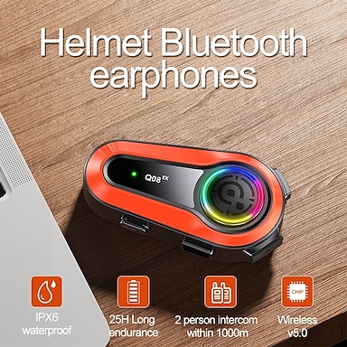 Système d'intercom Bluetooth pour casque moto Q08-2X, portée de 1000 m, communication sans fil 5.0, autonomie de 25 h, étanchéité IPX6, éclairage RGB, haut-parleurs intégrés.