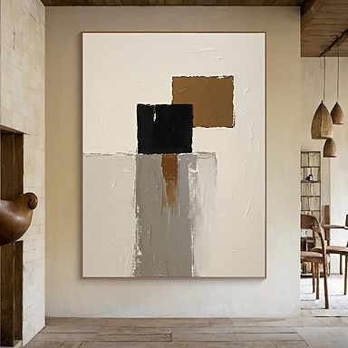 Grande peinture à l'huile abstraite géométrique beige crème, style wabi-sabi moderne, art mural minimaliste marron et noir, peinture texturée beige