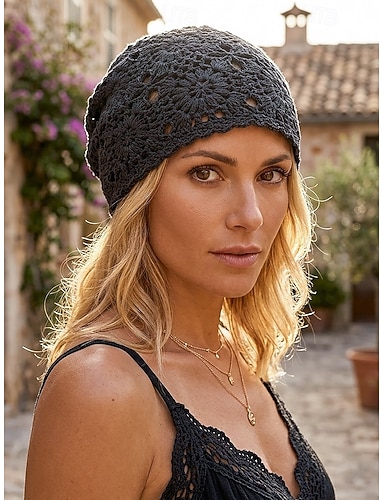 Bonnet bohème fleuri au crochet pour femme, en maille de coton mélangé, disponible en plusieurs couleurs, idéal au quotidien, en voyage ou pour un look balnéaire.