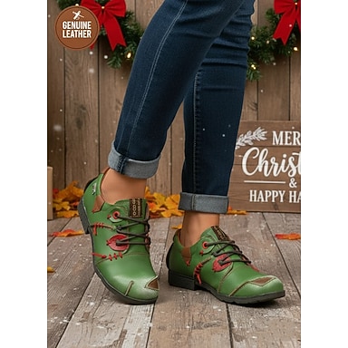 Chaussures Oxford à lacets en cuir vert pour femmes avec détails de coutures rouges, chaussures plates décontractées rétro faites à la main pour dames, parfaites pour les tenues de Noël et les vêtements de tous les jours d'automne