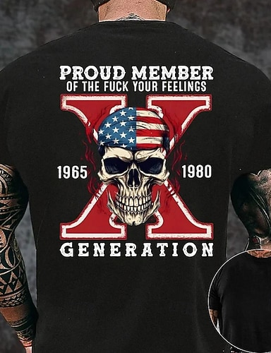 T-shirt graphique pour hommes "Fuck Your Feelings" - Crâne fier de la génération X Design de drapeau américain 1965-1980 manches courtes noir