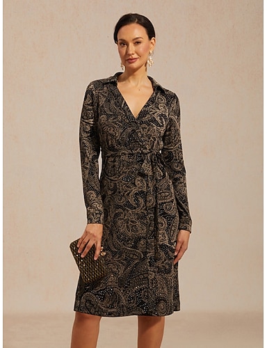 Robe midi portefeuille pour femme, robe trapèze élégante pour tous les jours, idéale pour les mariages et les invités. Motif jacquard pailleté, nœud sur le devant, coupe classique, manches longues,