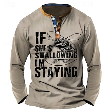 Chemise Henley à manches longues pour hommes graphique de pêche amusant avec le jeu de mots 'Si elle l'avale je reste' Tee d'humour pour adultes