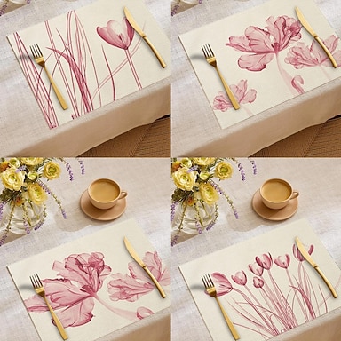 Set de table rectangulaire en tissu rose à motif tulipe, 100 % polyester tissé, orné d'un motif abstrait de plantes vertes à l'encre, lavable en machine et résistant à la chaleur, protège votre table.
