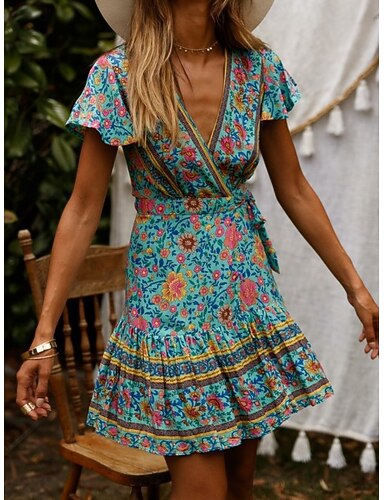 Femmes Mini Robe Robe bohème Robe Décontractée Robe Fleurie Élégant Mode Moderne Extérieur Vacances Sortir Coupe régulière Fleuri Manche Courte Col en V Rouge Rouge Bordeaux Fuchsia Orange Ét