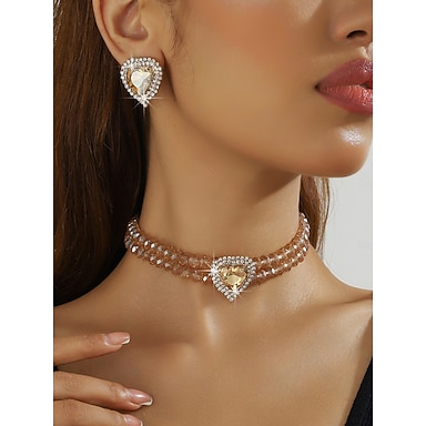 ras-de-cou en cristal champagne pour femme &Ensemble de boucles d'oreilles puces, bijoux en strass en forme de cœur, style romantique et élégant pour une soirée romantique de la Saint-Valentin