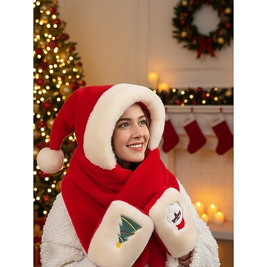 Ensemble écharpe et gants de Noël pour femme, design à capuche avec broderies du Père Noël et de l'arbre, accessoire d'hiver chaud pour les vacances