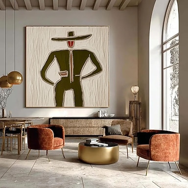 Peinture à l'huile originale faite main représentant un cowboy de l'Ouest avec un grand chapeau et un café. Portrait moderne pour la décoration intérieure. Art sans visage, style wabi-sabi vert.