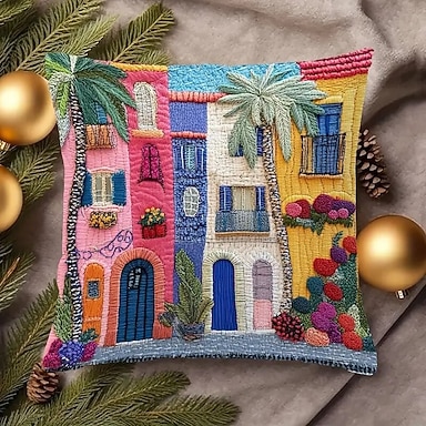 Housse de coussin de style méditerranéen avec impression plate 2D sur une seule face, représentant une scène de ville colorée avec des plantes et des fleurs. Housse de coussin décorative pour canapé,