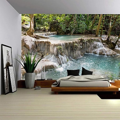 Grande tapisserie murale artistique représentant un paysage de cascade et de plantes naturelles, idéale pour décorer une chambre ou un salon. Cette tapisserie murale, imprimée sur un fond