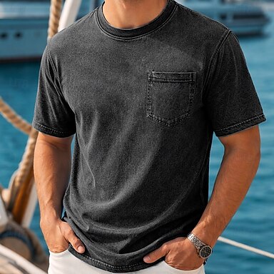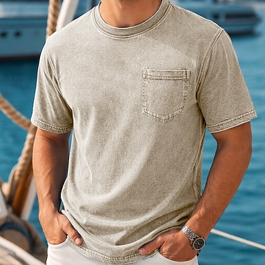 Homme T-shirt Chemise jean Chemise 100% coton délavée à l'acide Manche Courte Col montant Henley Automne & Hiver Printemps Automne Uni ancien Streetwear Occasionnel Avec Poches Teinture en vêtement