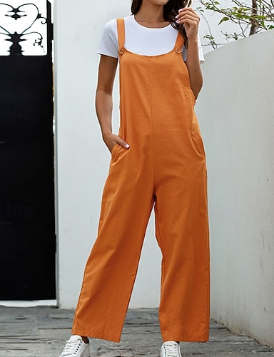 Combinaison pantalon femme décontractée, couleur unie, sans manches, col rond, poche, style streetwear, imitation coton et lin, coupe classique, noire, vert kaki, rose poudré, été