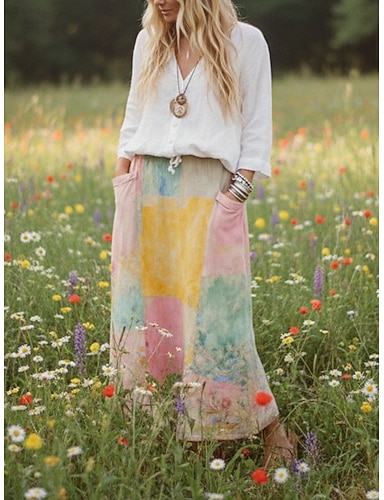 Jupe de vacances pour femme, style bohème vintage, jupe longue décontractée taille mi-haute, imprimé floral, non extensible, idéale au quotidien, vert clair, rose, bleu clair, été