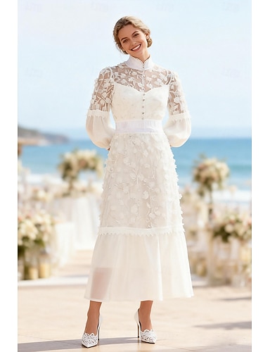 Ligne A Longueur thé Robe Blanche petite robe blanche ancien Petites Robes Blanches manche longue Col haut Mariage avec Fleurs 3D