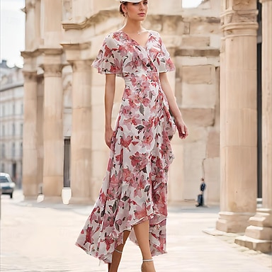Robe de fête A-Line longueur cheville robe de cocktail robe invitée mariage robe mère de la mariée manches courtes décolleté en V élégante vintage satin invité de mariage avec nœud(x) fleurs