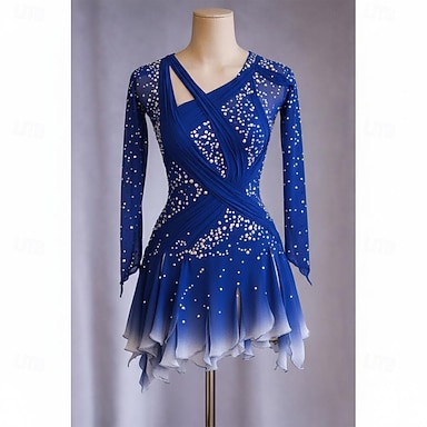 Robe de patinage artistique Femmes Patinage Robe Bleu Patchwork Dos Nu Micro-Élastique Entraînement Compétition Tenue de Patinage Classique cristal pailleté manche longue Patinage sur glace Patinage