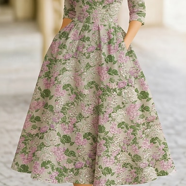Ligne A Longueur au sol Robe de Soirée Tenue de soirée Élégant Manche 3/4 Col en V Mariage Formel Poche Nylon avec Imprimé floral Froncé
