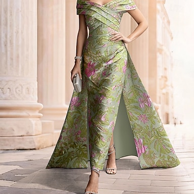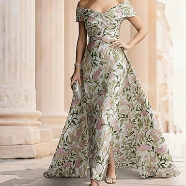 Ligne A Asymétrique Longueur cheville Robes de Cocktail Robe de Soirée Tenue de soirée Élégant ancien Manche Courte Col en V Mariage Formel Nylon avec Imprimé floral Poche