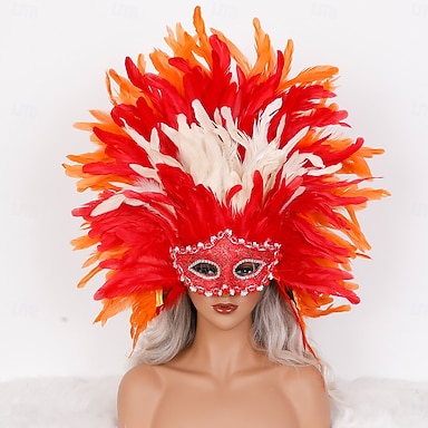 Carnaval 2026 Accessoires de Carnaval de Rio Samba Masque de Carnaval en Plumes Coiffe Masque en Plumes Complètes Rouge Orange et Blanc Costume de Performance au Brésil