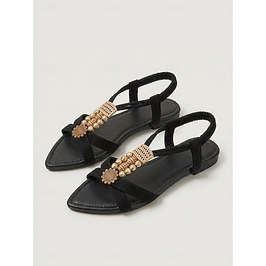 Sandales plates noires à perles pour femmes - sandales bohèmes confortables ornées de pierres précieuses, idéales pour les vacances à la plage et les visites touristiques en plein air. &vêtements de