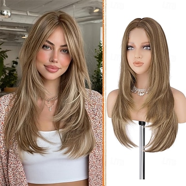 Perruques châtain clair pour femmes, perruques longues dégradées avec frange rideau, perruque synthétique aspect naturel pour un usage quotidien ou de soirée, 66 cm (26 pouces), blond mélangé châtain