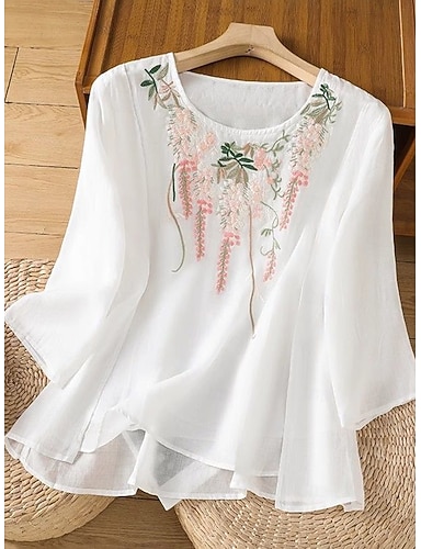 Femmes Petites Tailles Chemise Broderie Uni Bohème Mignon Élégant Demi Manches Manches bouffantes Col rond Hauts Réguliers Quotidien Sortir Week-end Blanche Vert Claire Rose Claire Été