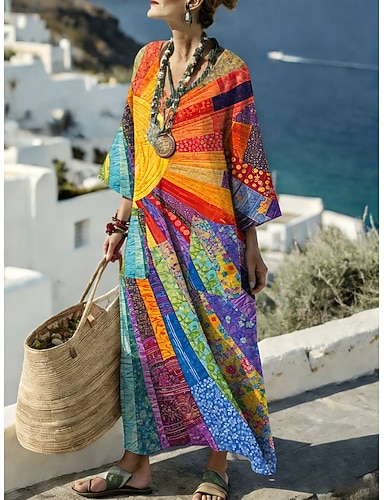 Robe Maxi Femme En Lin Comme Robe Tunique Décontractée Quotidienne Coupe Ample Imprimé Graphique Géométrique Manches Longues Col V Bleu Orange Vert Rose Pink Été Printemps