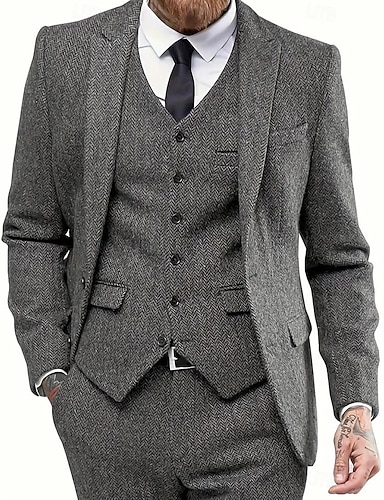 Pour des hommes Costumes en Tweed Occasionnel Affaires Noir Grise Automne Costume / Tailleur Revers en Pointe Formel Chevrons Coupe sur mesure 3 pièces Simple boutonnage un bouton