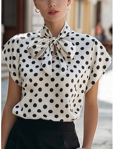 Femmes Chemise Chemisier Haut à pois Nœud Géométrique Élégant Basique Classique Manche Courte Cravate au cou Hauts Réguliers Quotidien Bureau Fête Noir Blanche Rouge Été Printemps