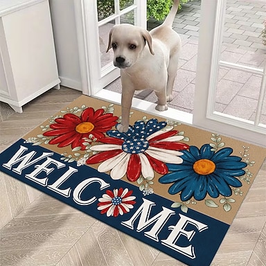 Tapis de porte commémoratif du 250e anniversaire des États-Unis, idéal pour la fête nationale américaine du 4 juillet. Ce tapis arbore un drapeau américain, un aigle à tête blanche, des feux d'artifice et des ballons rouges, blancs et bleus aux couleurs p