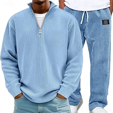 Homme Ensembles assortis Bleu Sweatshirt Pull Jogging à Jambes Larges Pantalons Pantalon en velours côtelé Ensembles manche longue Demi-zip Extérieur Vacances Bloc de Couleur Avec Poches 2 pièces