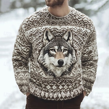 Homme Animal Loup Pull Pull Fair Isle Tricots Col Rond Occasionnel Vacances Quotidien Impression 3D Garder au chaud manche longue Printemps Automne Hiver Marron