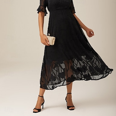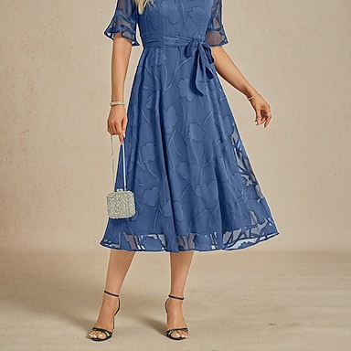 Femmes Robe Midi Robe trapèze Élégant Quotidien robe demoiselle d honneur Date Dentelle A Volants Manches Transparentes Coupe régulière Fleuri Manche Courte Col en V bleu marine