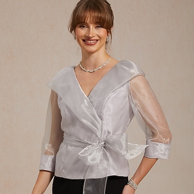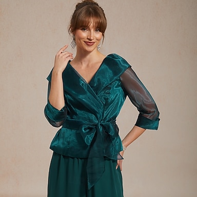 Femmes Hauts Élégants Nœud devant Manches Transparentes Élégant Manche 3/4 Col en V Col de chemise Hauts Réguliers robe demoiselle d honneur Tenue de cocktail Vert Emeraude Été Printemps Automne