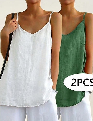 Lot de 2 chemises en coton et lin pour femme, sans manches, patchwork, boutons, unies, élégantes et basiques, col V, coupe classique, parfaites pour le quotidien, les vacances ou les sorties. Blanc +