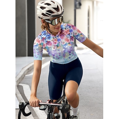 Femmes Maillot de cyclisme Graphique Dégradé Motif Floral Manche Courte Cyclisme Maillot Top avec 3 poches arrière Écran solaire Résistant aux UV Séchage Rapide Bandes réfléchissantes Des sports Bleu