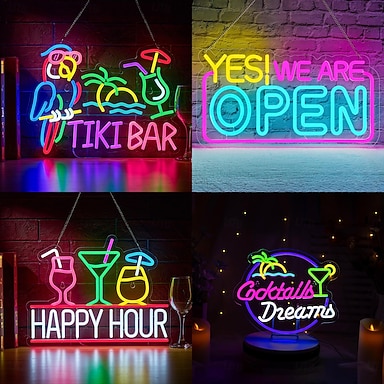 Enseigne lumineuse LED néon en forme de perroquet, cocotier et cocktail, dimmable, alimentée par USB, idéale pour la décoration murale, ambiance hawaïenne, piscine, bar tiki, chambre, salon, salle à
