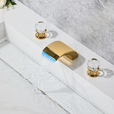 Robinet de lavabo de salle de bain moderne avec effet cascade LED, finition dorée polie, robinet de vasque à 3 trous, montage sur plage, 2 poignées, éclairage LED à changement de couleur alimenté par l'eau, corps en laiton massif, valve en céramique.