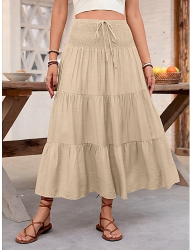 Femmes Jupe de vacances Mode Occasionnel Midi Taille haute Jupes Uni Froncé Cordon de serrage Micro-Élastique Quotidien Rue Kaki Été Nylon Viscose