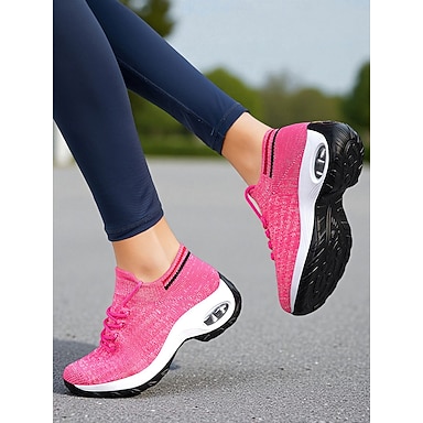 Baskets compensées Flyknit roses pour femmes avec détails en strass – Chaussures de sport légères et respirantes pour une tenue décontractée et la marche