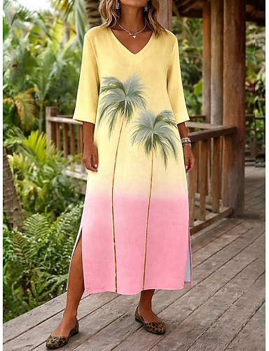 Femmes Robe maxi Robe bohème Robe fourreau Robe d'Été Robe en lin Bohème Vacances Ethnique Plage Fête Date Coupe Ample Graphique Abstrait Tropical Manche 3/4 Col en V Bleu Jaune clair Rose Claire